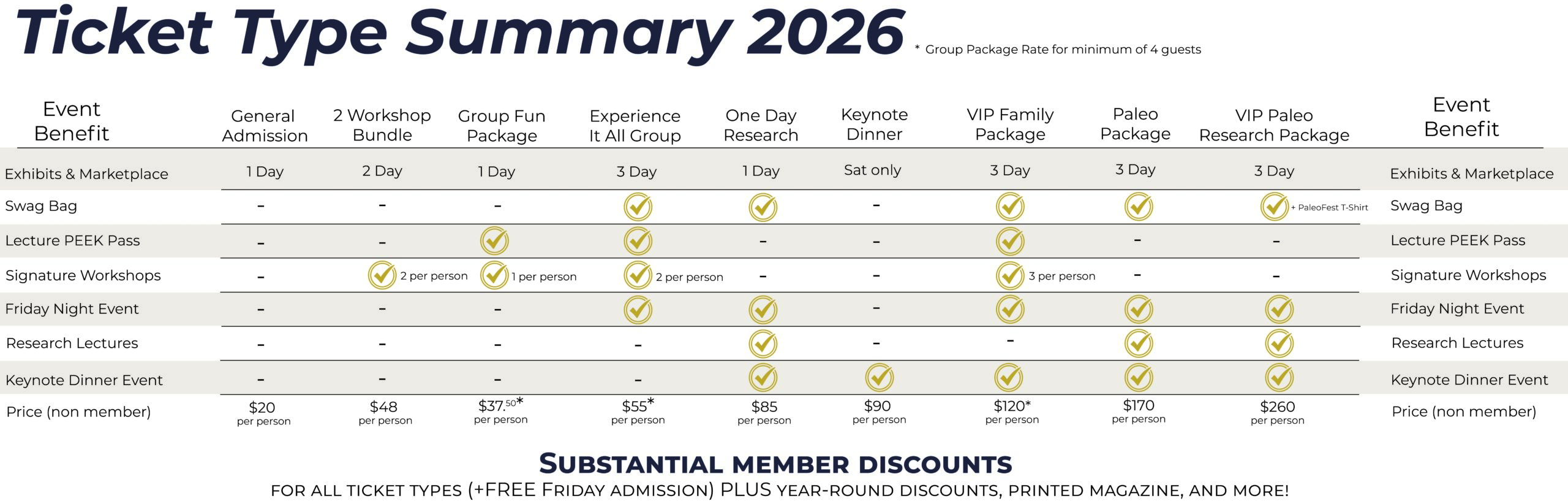 $150 per family of 4 / $80 per family of 4 for members. Includes 1 PaleoWorkshop, 1 Lecture Peek, and general admission for the day! (additional people may be added at discounted group rate) POPULAR CHOICE!