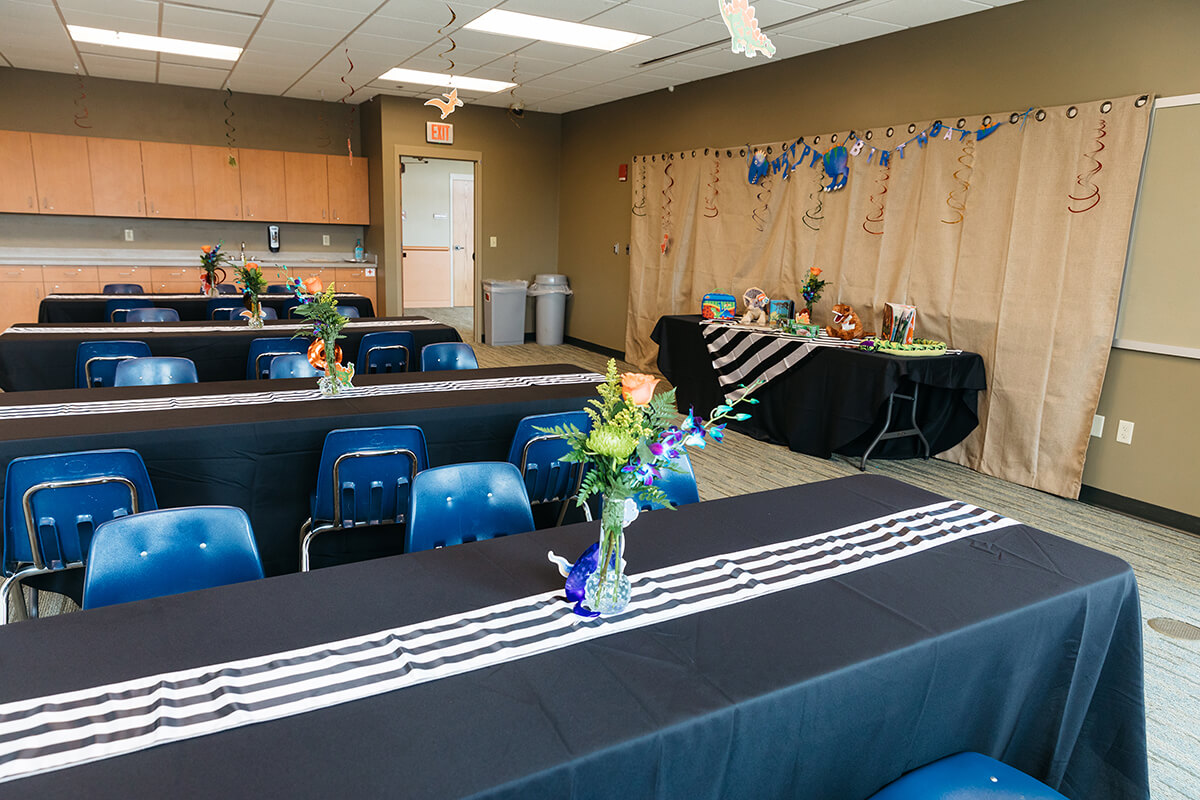 From medium to large birthday parties to corporate lectures, this classroom style setting provides a private space near bathrooms and the exterior terrace.